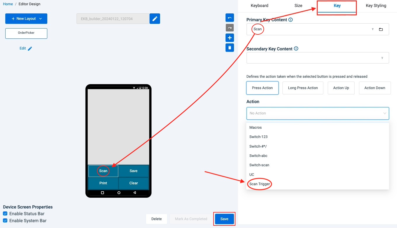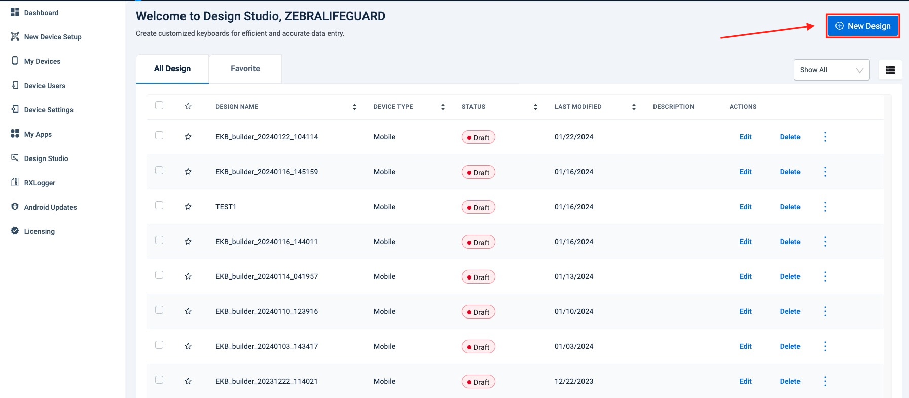 Enterprise Keyboard Design Studio is a cloud-based tool within the ZDNA console for creating customized key layouts to enhance an application and promote efficient and accurate data entry. Layouts created with EKB Design Studio work on Zebra Android devices that use Zebra's Enterprise Keyboard (EKB) 4.1 (or later), and can be displayed programmatically using Android intents or through DataWedge 7.4.4 (or later).