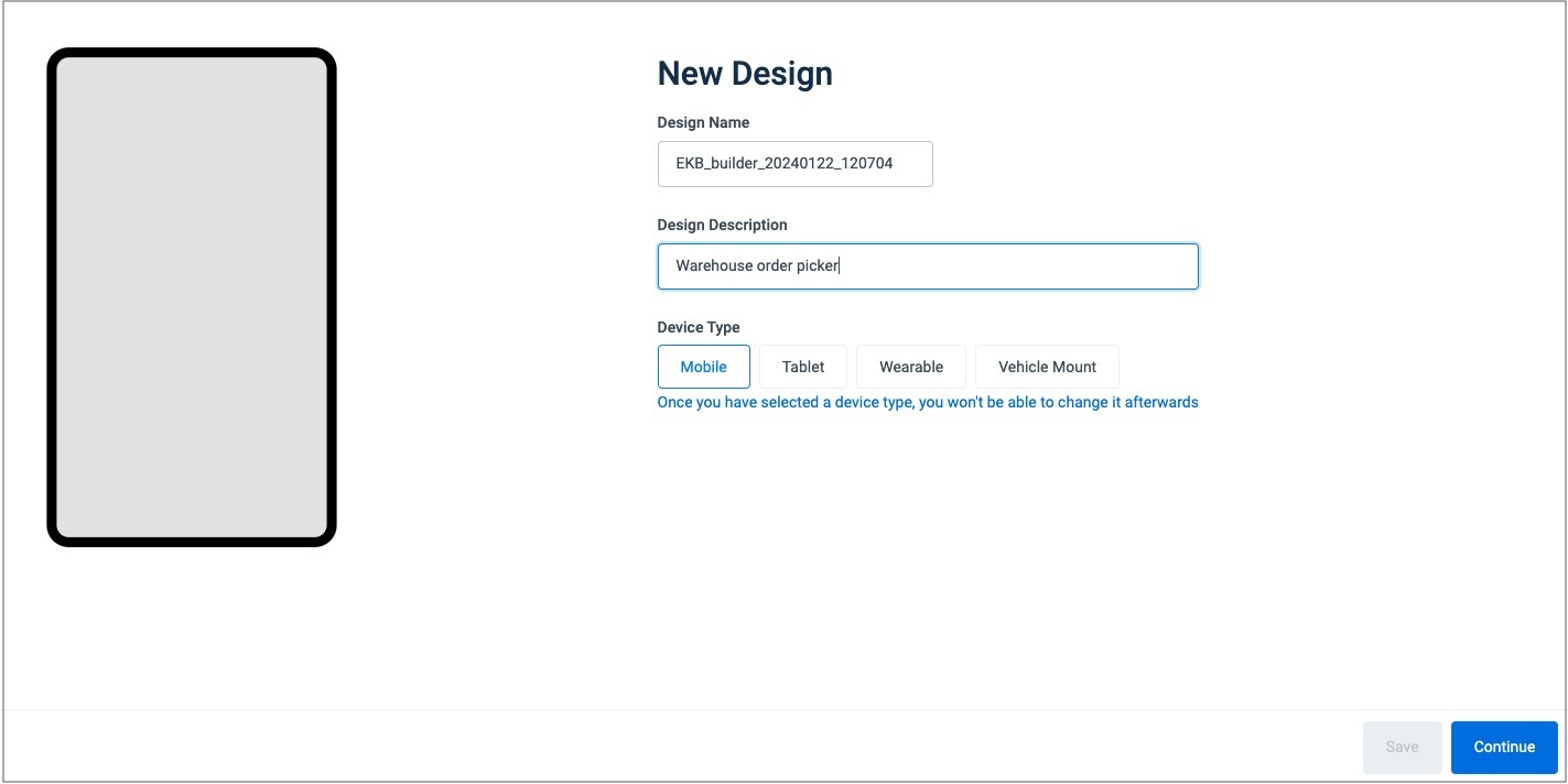 3. Enter a name (or accept auto-generated default). Add a brief description and select the device type and click “Continue” to proceed.