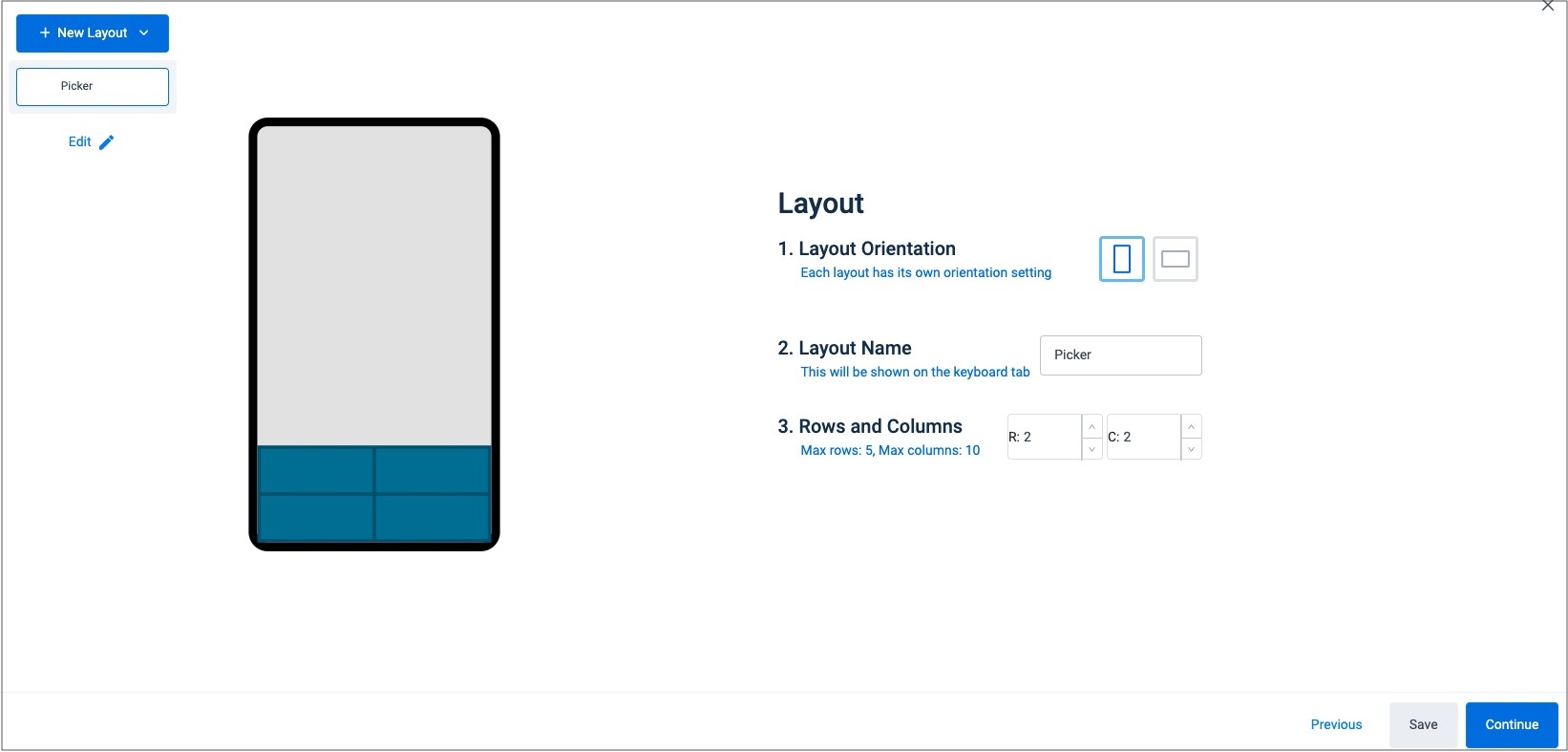 4. Select intended orientation, layout name* and grid dimensions and click “Continue” when finished.