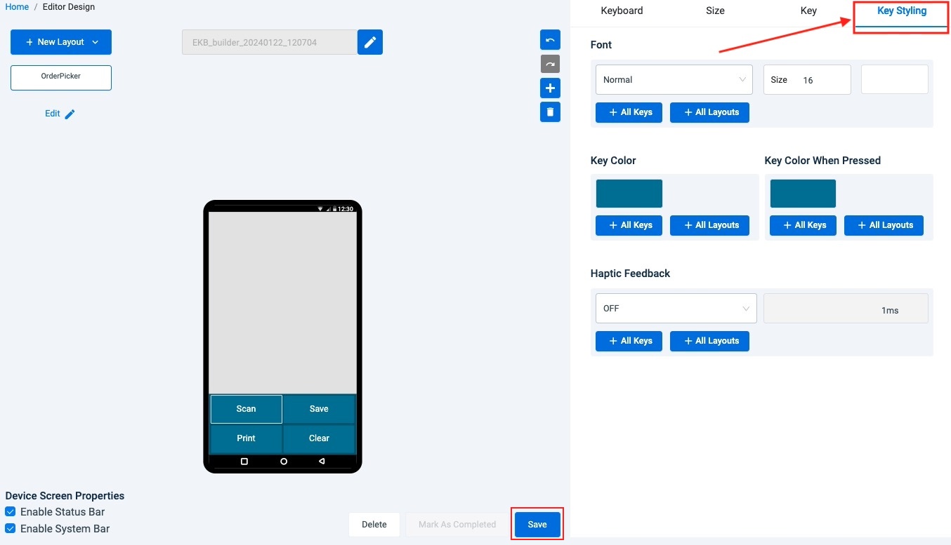 Click "Save" button when finished. Then select "Key Styling" tab to continue. Click image to enlarge, ESC to exit.