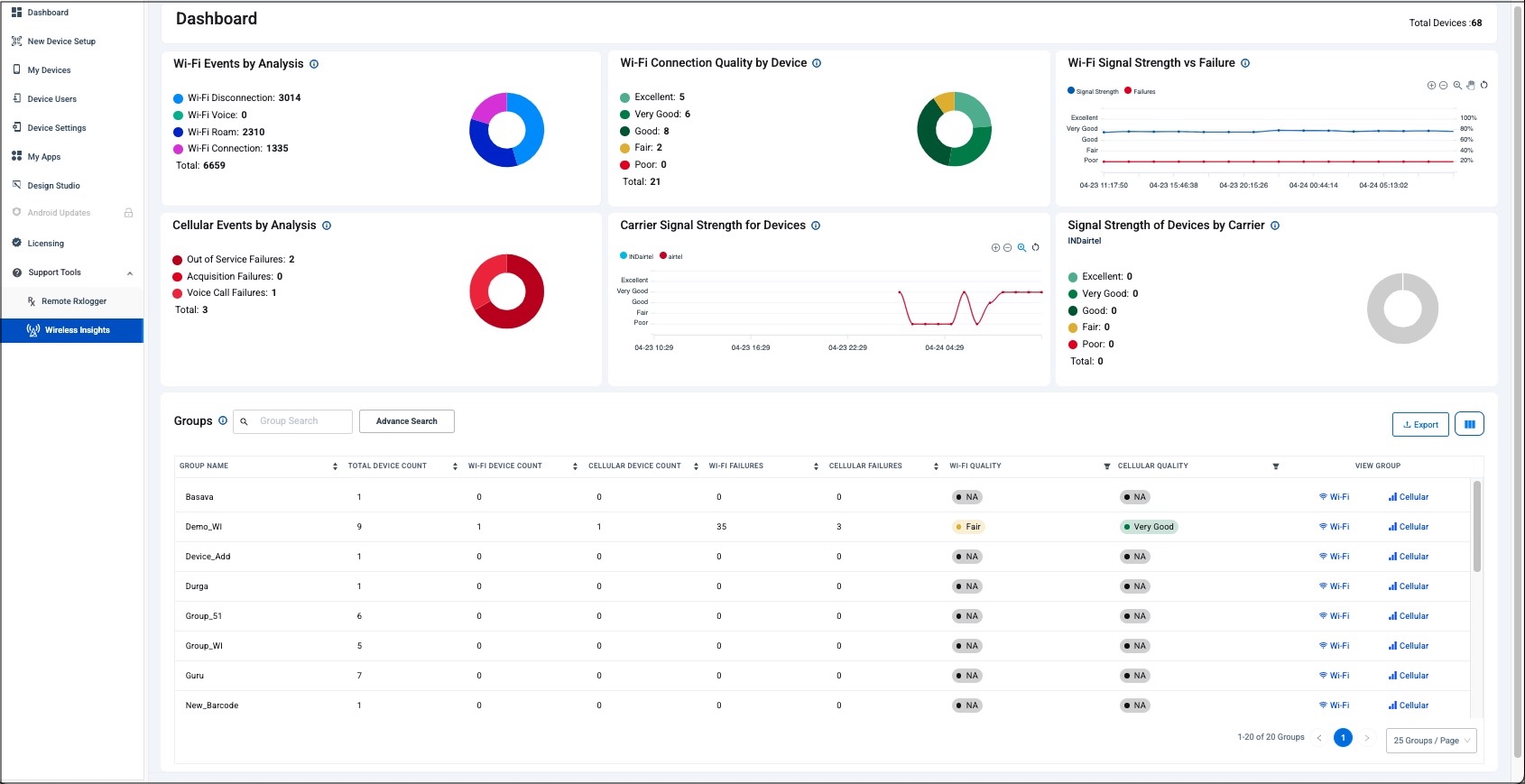 The Wireless Insights dashboard shows real-time Wi-Fi (top row) and cellular performance for active devices.