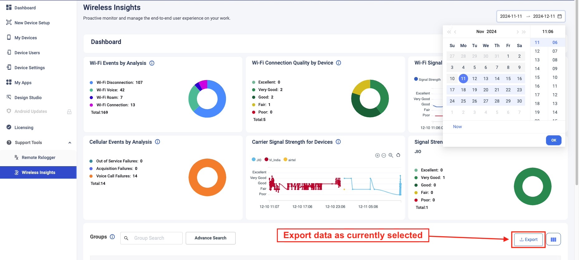 Click the date selector to analyze wireless data for a particular date and/or time range (max. = 30 days):