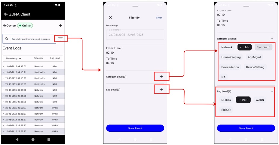 The Zebra DNA Client is installed at device enrollment that displays logs of device operations, system health and connection activities relating to DNA Cloud. This can provide device users and/or support staff with important troubleshooting capabilities by exposing problems or potential problems before they arise. Logs are refreshed automatically, displaying the latest events at the top, and allow searching and filtering activities by category, status and date/time, helping to ensure efficient device oversight and management.